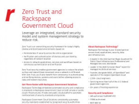 Rackspace Government Cloud on AWS is built on a Zero Trust security architecture, enabling you to innovate mission-critical solutions quickly on a compliant, automated and fully managed Platform-as-a-Service.